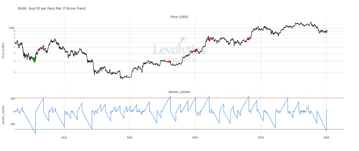 Negative value = OI for the average altcoin perpetual swap pair has been decreasing consistently over x periods (i.e. z-score has been consistently negative)