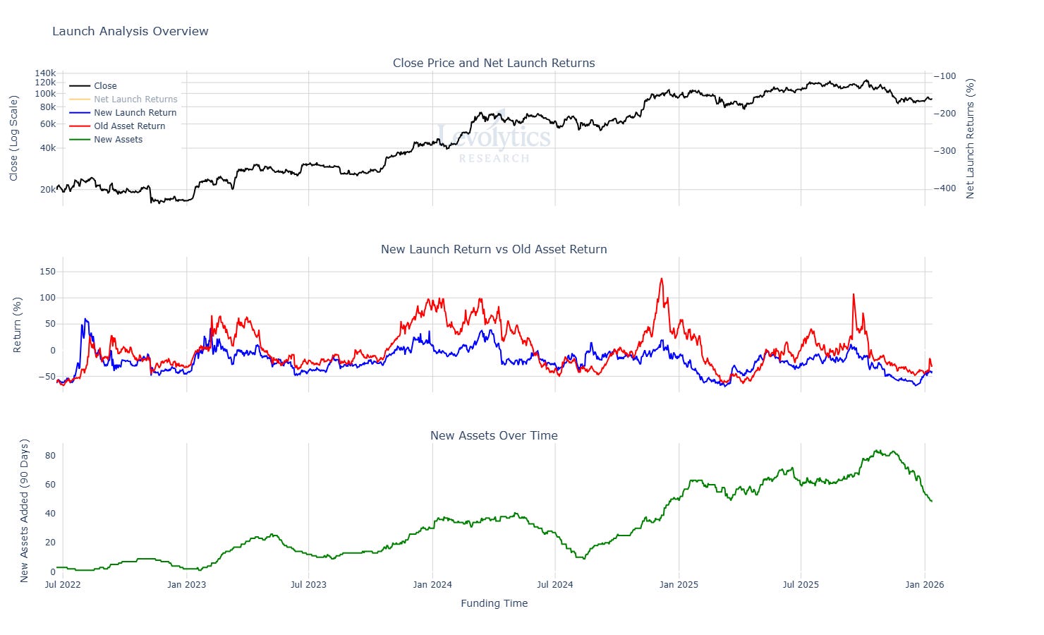Metric 2: Average 90-Day % Return for Old Assets on Binance Perps (Red) vs New Assets on Binance Perps (Blue)
